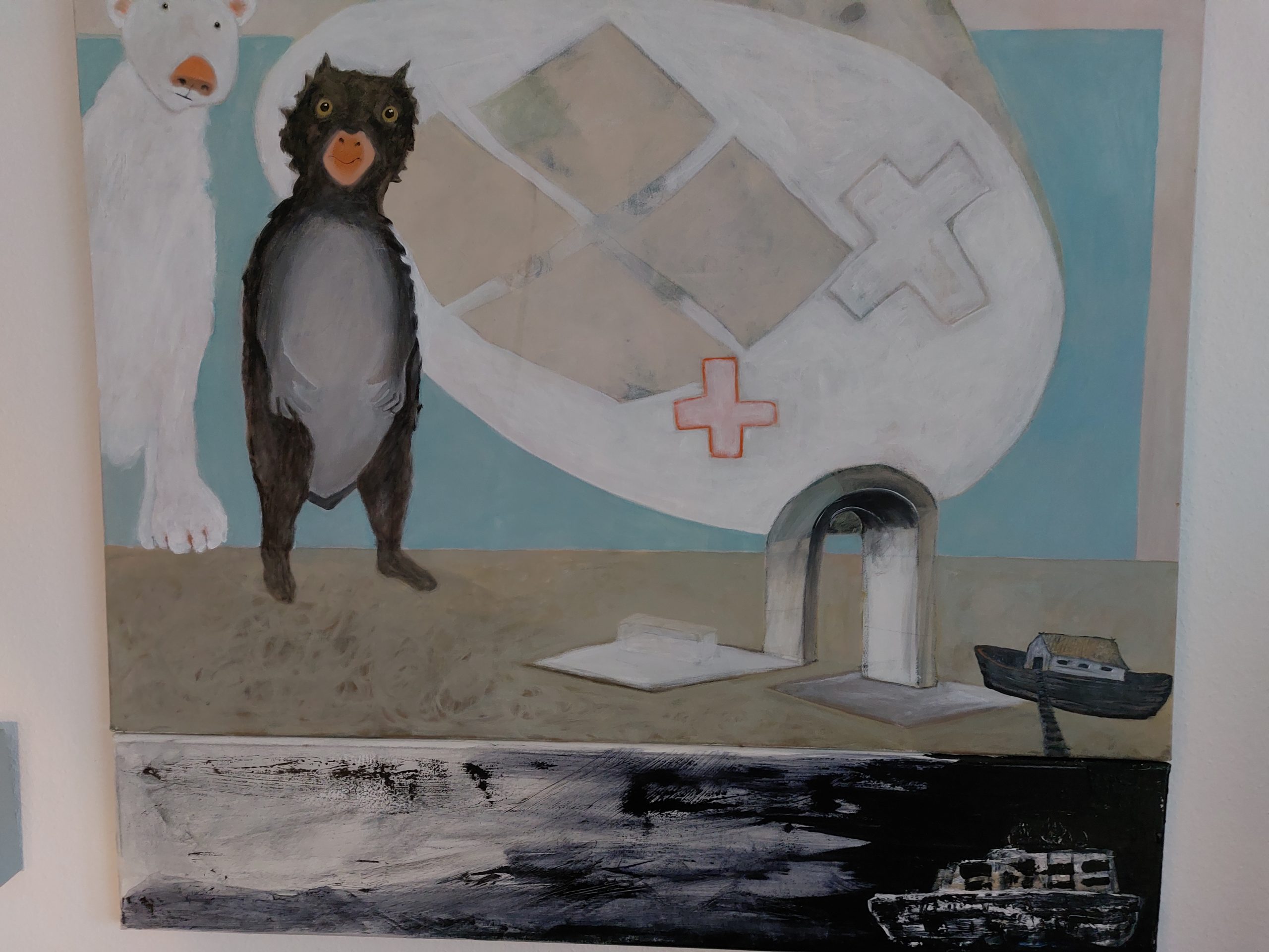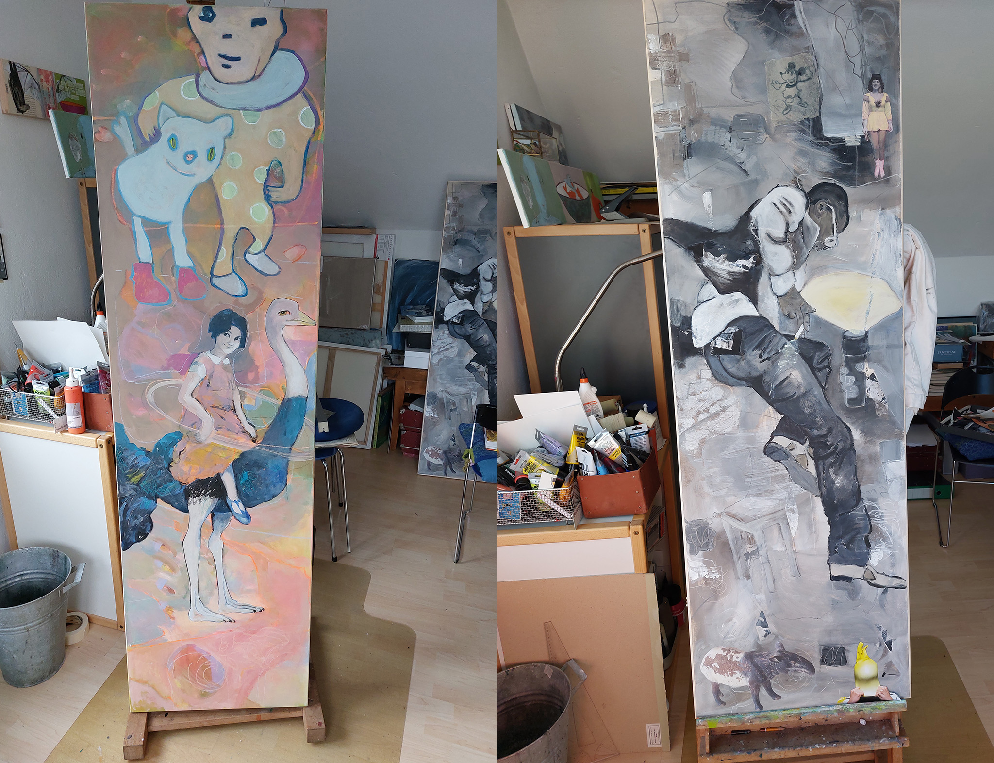 IN DER TAT ist ebenfalls eine Künstlergruppe aus Bonn. Malerei und Collagen stehen gleichberechtigt nebeneinander…begonnen wird fast immer mit einer gemeinsamen Grundierung und Austausch über ein evtl. Thema. Die Arbeit wechselt danach mehrfach zwischen uns…wird ergänzt, übermalt… neu komponiert, bis sie stimmt und dann mit dem Stempel als fertig/abgeschlossen gilt.