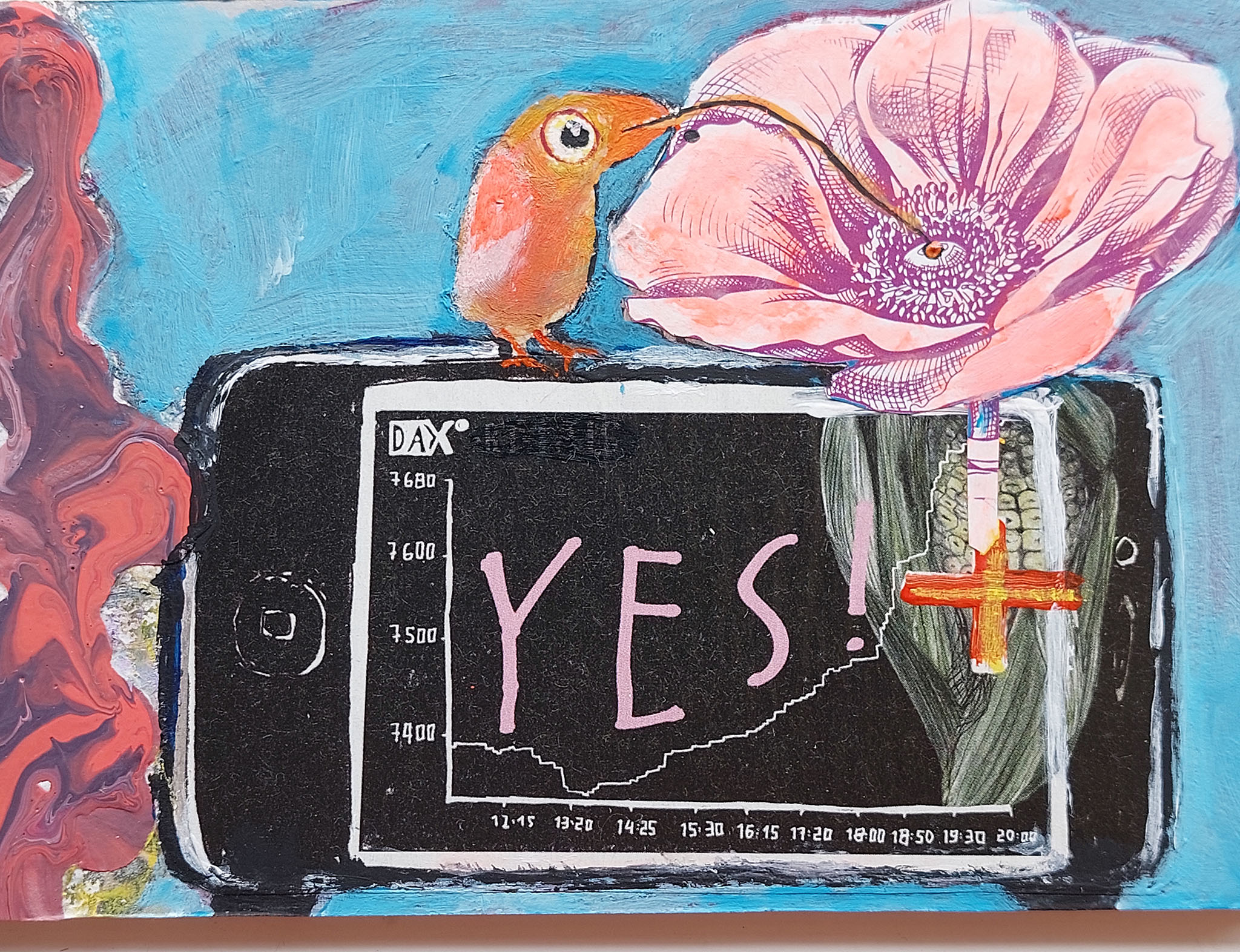 IN DER TAT ist ebenfalls eine Künstlergruppe aus Bonn. Malerei und Collagen stehen gleichberechtigt nebeneinander… begonnen wird fast immer mit einer gemeinsamen Grundierung und Austausch über ein evtl. Thema. Die Arbeit wechselt danach mehrfach zwischen uns… wird ergänzt, übermalt… neu komponiert, bis sie stimmt und dann mit dem Stempel als fertig/abgeschlossen gilt.
